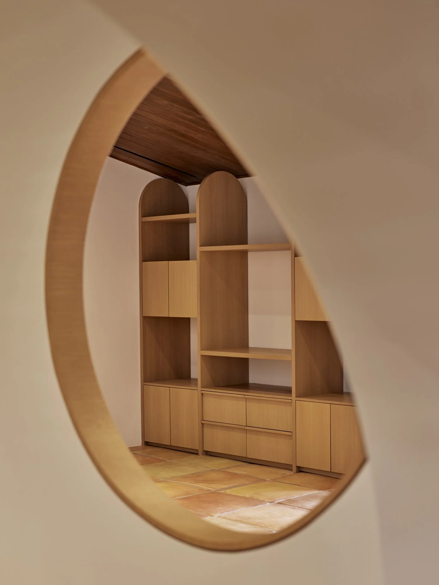 The owners seek to not only be at home but to be in a comfortable sanctuary where they can connect with natural elements and lush surroundings. The living spaces throughout the home, including the family room and bar adjacent to the kitchen, incorporate materials that evoke a feeling of being in nature. A ceiling covered in wood paneling with recessed architectural lighting casts warm light on complementary birchwood built-in cabinets and shelves. Stone furniture accents and countertops bring in the coolness of the earth, especially in the wet bar lounge area. A porthole cutout in the wall with modest wood shelving within creates a modern connection between rooms.