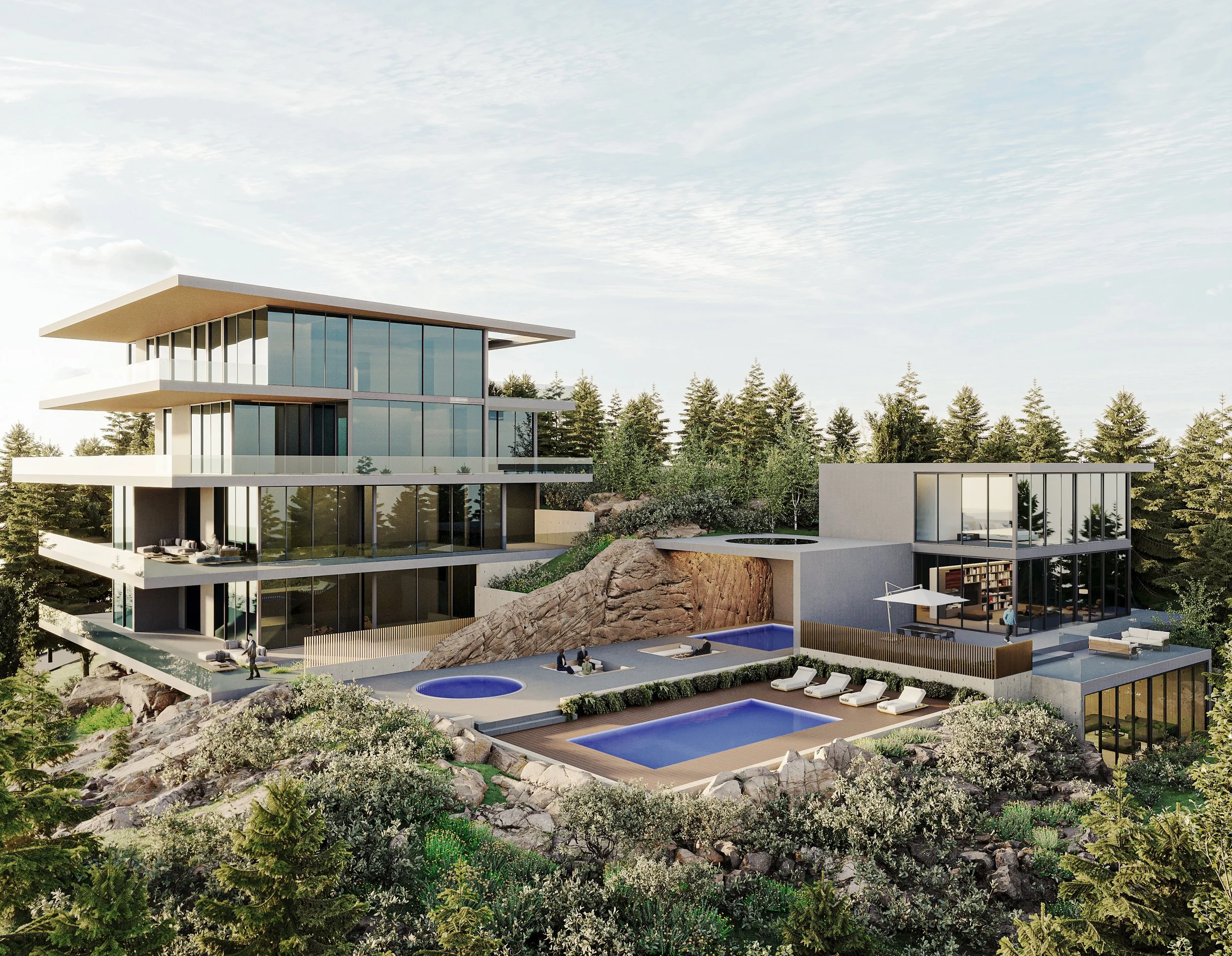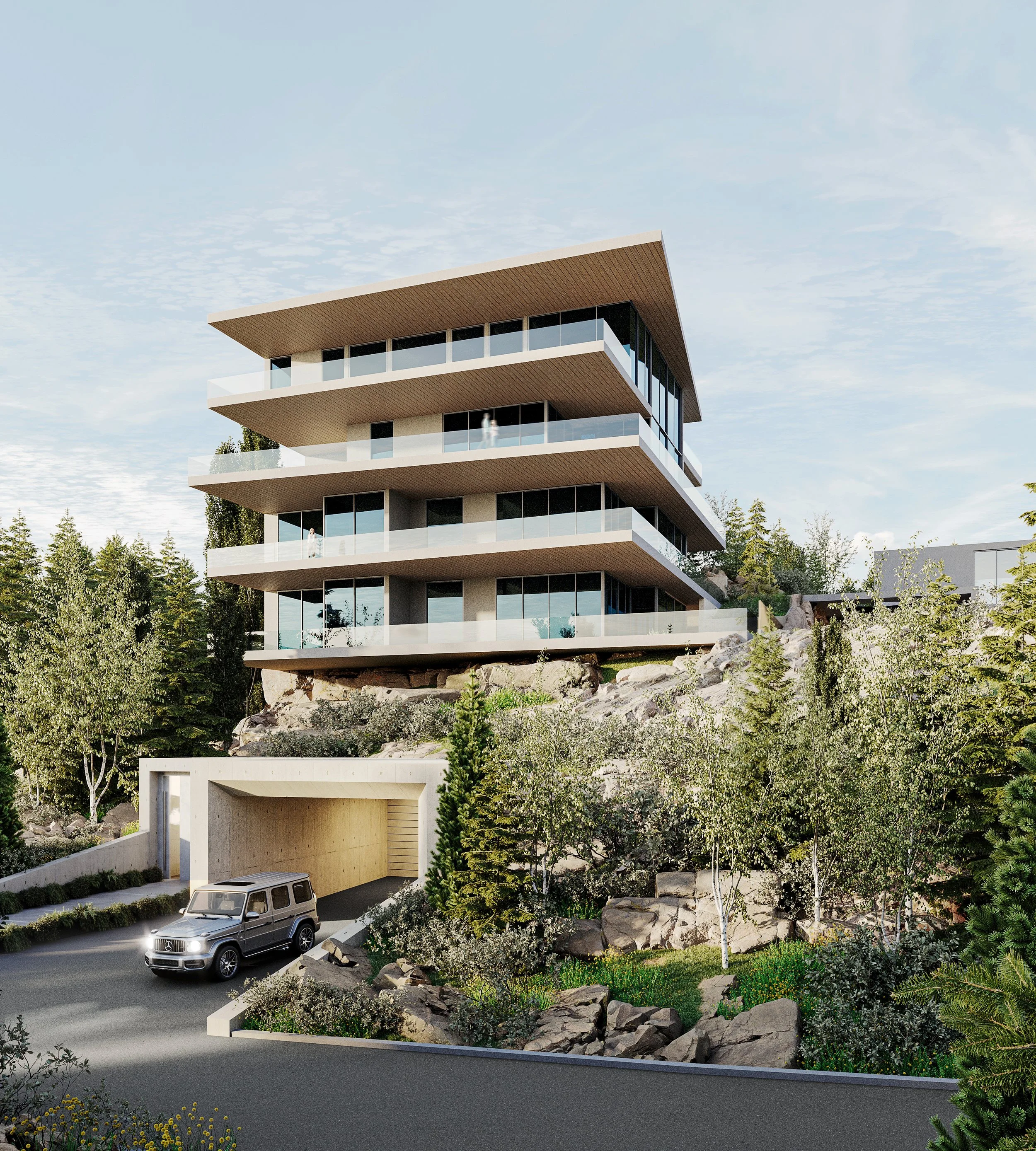 In the main building, levels one through four each contain individual units with four bedrooms, ensuite bathrooms, a public area, ample pantry, galley kitchen and open living and dining areas, in addition to a lounge/entertainment area and outdoor balcony. The top two levels are a duplex penthouse, each with double volume living/dining areas and windows overlooking the mountains as well as a private heated pool. Each unit is between 3,000-4,000 square feet in livable space.