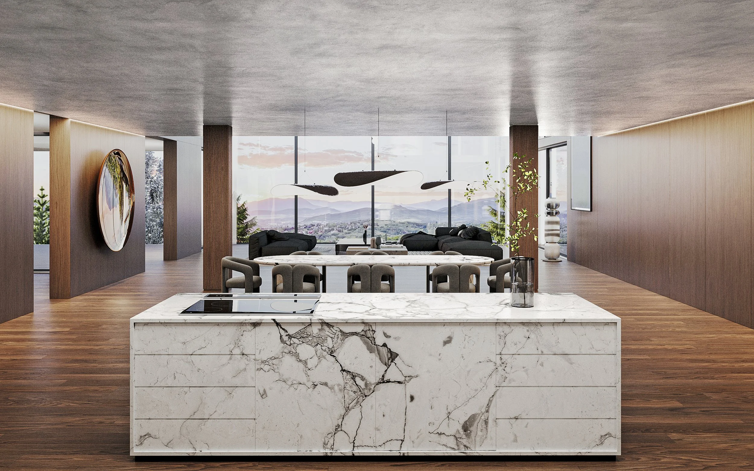 Inside, wood and concrete with other natural materials enhance the cozy warm feeling of a winter escape. Inspired by the area’s natural surroundings, changing seasons and outdoor activities, the colors and materials provide a living space that serves as a sanctuary for reflecting on the beauty of nature.