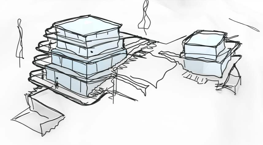 At nearly 90 feet high with a significant portion of the main building underground, including a spacious parking area with a tunnel connecting the buildings and a private elevator for each unit, the main building consists of six levels of living space.