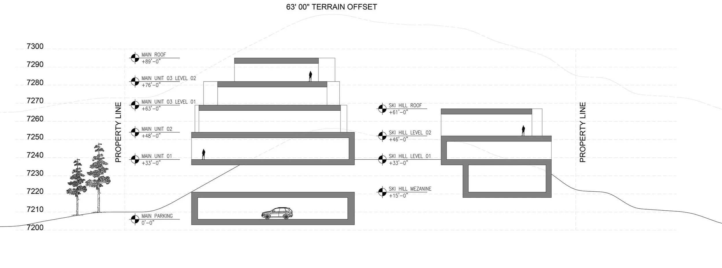 The adjacent building contains a single unit as well as an amenity floor, and is connected to the main building by a cozy outdoor amenity area. The apres ski courtyard is meant to be used throughout the year, with a temperature controlled pool, lounge seating around firepits overlooking the mountains, covered hot tubs, and terraces landscaped with native natural elements and flora for easy outdoor access between the building’s levels.