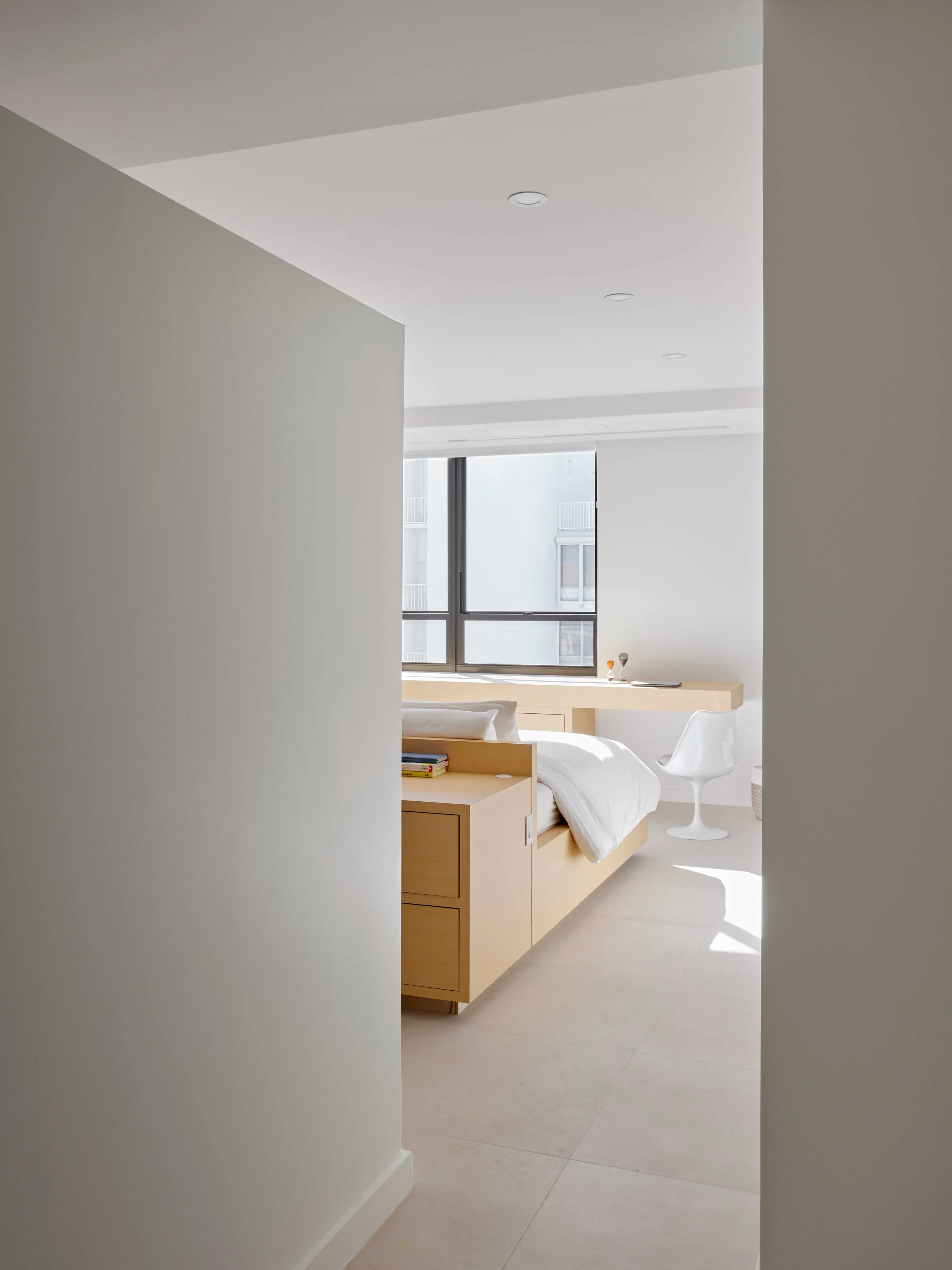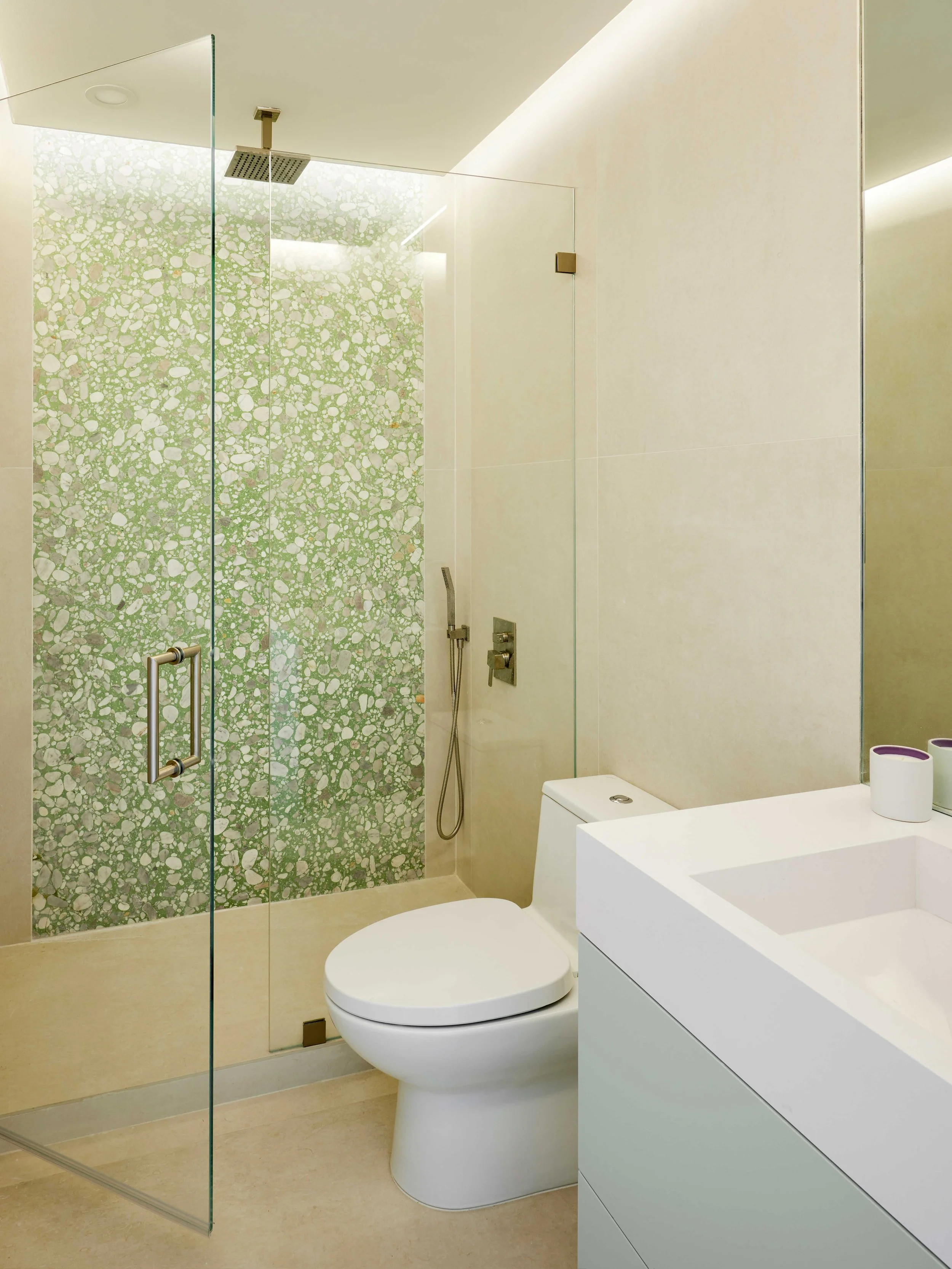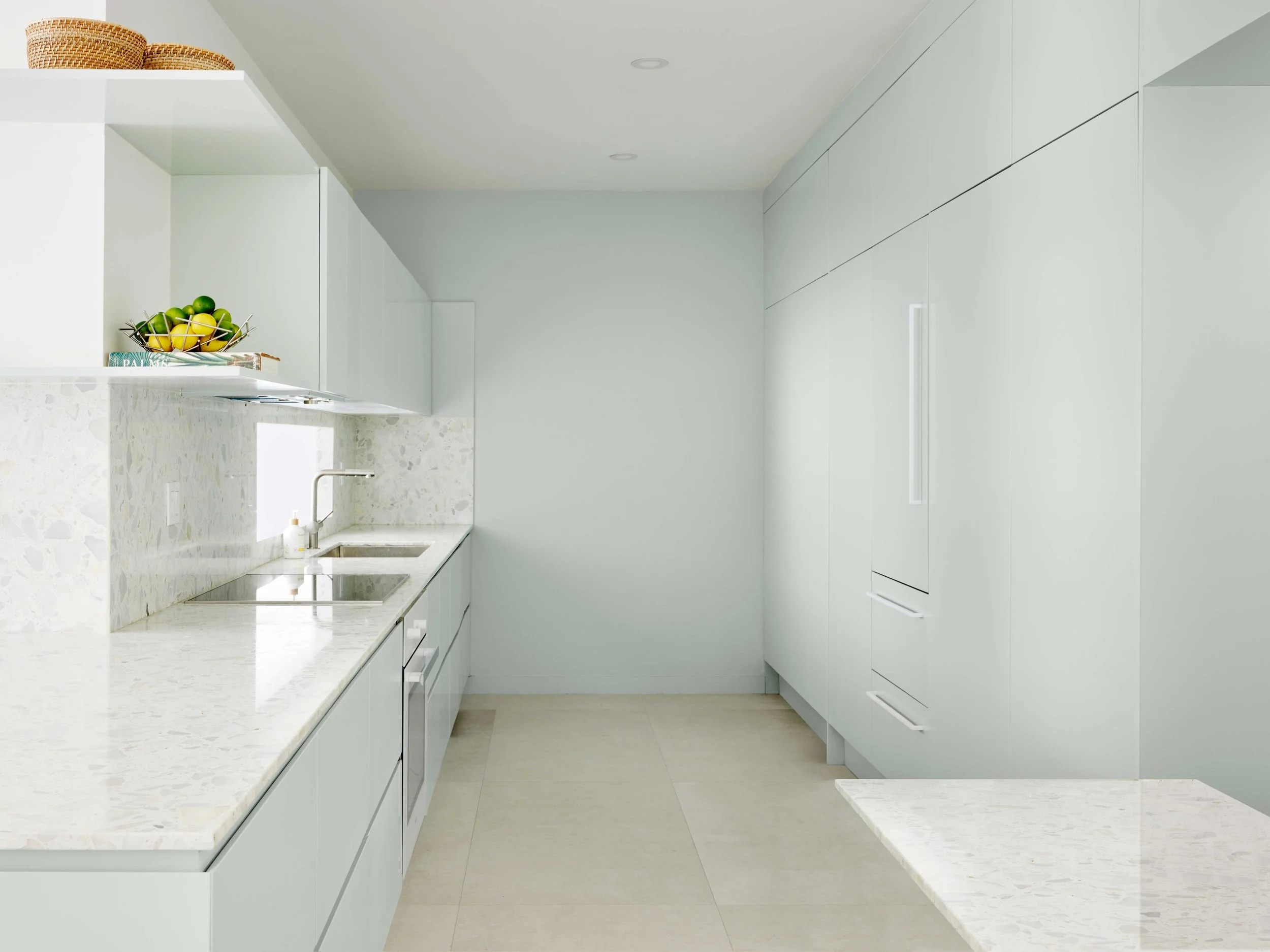 Located along the seaside in Bal Harbour, this residence evokes the ease of seaside living. With optimal storage, seashell terrazzo, and seafoam color accents, residents can feel the gentle mood of the beach throughout the home. Floors throughout the home are large format ceramic tiles and filled honed-finish travertine. The interior features all custom built-in millwork in white oak veneer in the living and dining room, the kitchen has a full custom cabinetry with seafoam green lacquer and oyster pebble terrazzo. The family area and master bedroom are designed with full custom millwork in white oak veneer. The balcony includes impact windows and anti-slip porcelain tiles. Products used include: Refin Ceramic tiles, Naturali Stone, Miseno, RBW Lighting, and Fisher and Paykel appliances.